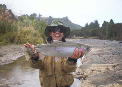 金曜の夜に、根岸さん、黒木さん来宅。ああだこうだごちゃごちゃいいながら、ワインを4本倒す。 土曜日は、トンガリロ川で釣り。いい感じにうっすらと色が入っていたのに、魚は入っておらず、あちこちをしつこくくまなく狙って、ようやく釣れるという感じ。タウランガ・タウポ川に転戦したら、ごっちゃりと釣り人がいた。すごすごと引き上げ、ワイマリノ川に逃げ込む。結局ここでも敗退して、打ちのめされて帰宅。その晩は、またまたワインを4本とシャンペン1本を空ける。 翌日曜日はどこに行こうか迷った揚げ句、タウランガ・タウポ川に賭けることになった。中流部は、去年の暮れにあった大水で流れがまったく変わってしまったと聞いていたのだが、まだ行ってなかったので、その確認もかねてのお出かけだ。着いてみると、以前はだだっ広い牧場だったところをほぼ湖と化しながらトロトロと流れているではないか。昔の川にも少しくらいなら流れはあるだろうと歩いていってみたら、水も何も完全に干上がって元の川底には草が生えている始末。ありゃまぁと嘆きつつ、流れを求めて水のない川を歩くこと小一時間。ヘトヘトになるころ、ようやく本当の川に出会った。群れは入っていなかったものの、トンガリロ川よりははるかにましで、良い鱒と久々に遊んでもらう。でっぷり太った雌だったので、イクラ欲しさに迷わずキープ。 |